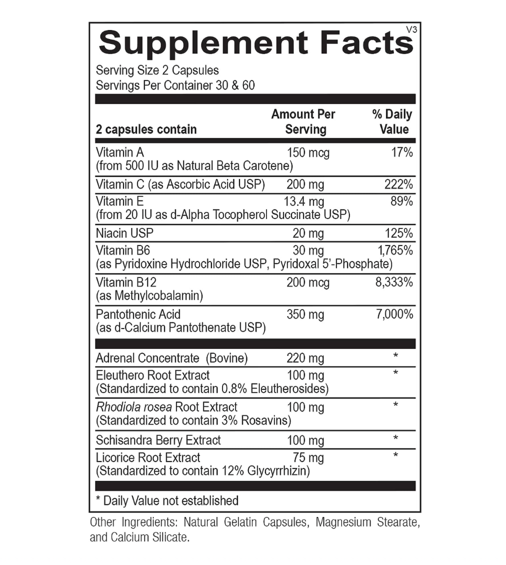 Contiene una mezcla de micronutrientes clave, hierbas adaptogenas y concentrado adrenal especificamente formulado para fortalecer la respuesta del cuerpo al éstres y apoyar los niveles saludables de energía. Proporciona además cantitdades de vitamina A y C, ácido pantotenico y otras vitaminas B que son fundamentales para la función de las glándulas suprarrenales. Esta poderosa formulación ayuda a apoyar el cuerpo a la reistencia a la fatiga y a mantener niveles adecuados de cortisol y DHEA.