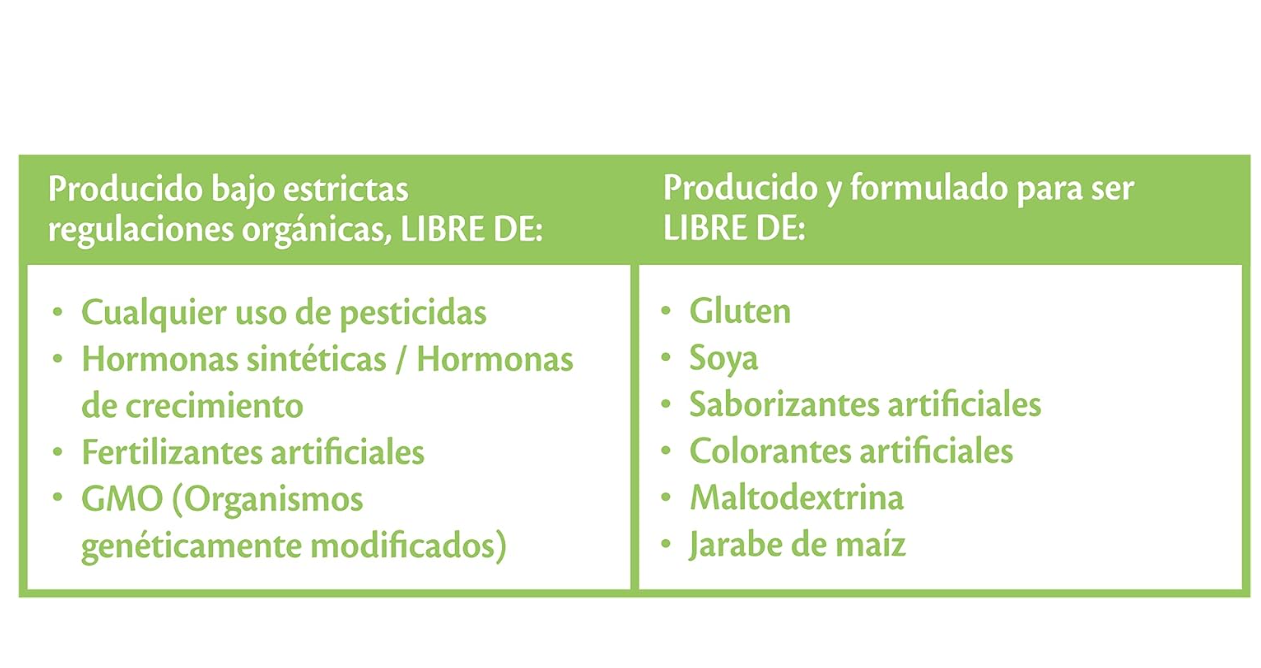 Cualquier uso de pesticida, hormonas sintéticas/ hormonas de cerecimiento, fertilizantes artificiales, GMO (Organismos genéticamente modificados), gluten, soya, saborizantes artificiales, colorantes artificiales, maltodextrina y jarabe de maíz.