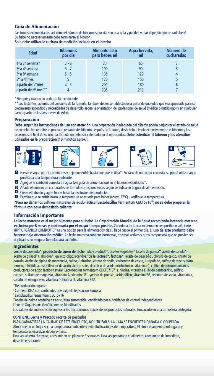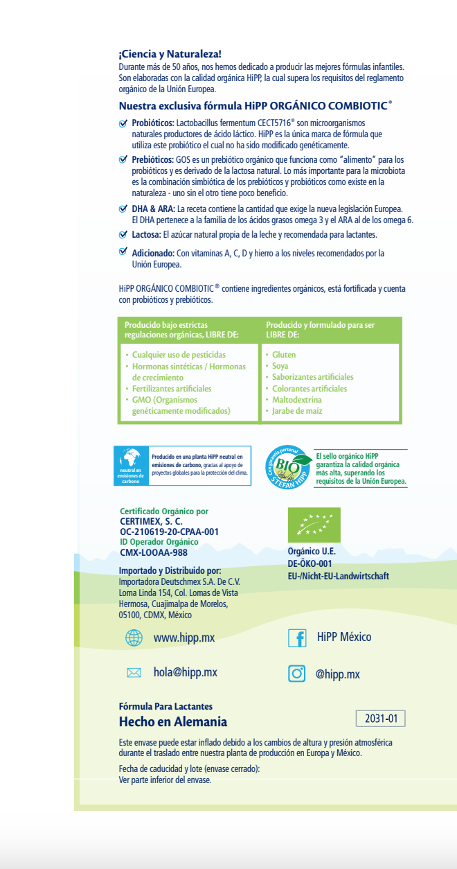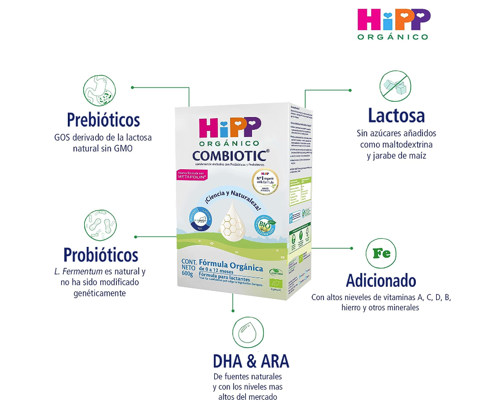 La fórmula orgánica más vendida en Europa. Fabricado en Alemania.HiPP Orgánnico Combiotic es recomendado para consumo desde el nacimiento hasta los 12 meses. Contiene DHA y ARA. El DHA pertenece a la familia de los ácidos grasos omega 3 y el ARA al de los omega 6. DHA extraído de fuentes naturales y orgánicas, certificado por el Marine Stewardship Council (MSC). SIN AZÚCARES AÑADIDOS. Contiene solo lactosa (el azúcar propia de la leche y recomendada para lactantes).