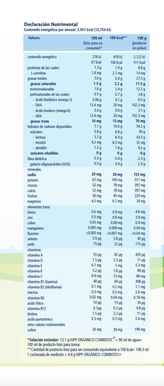 Probióticos: Lactobacillus fermentum (L. fermentum) son microorganismos naturales productores de ácido láctico. HiPP es la única marca de fórmula que utiliza este probiótico el cual no ha sido modificado genéticamente.