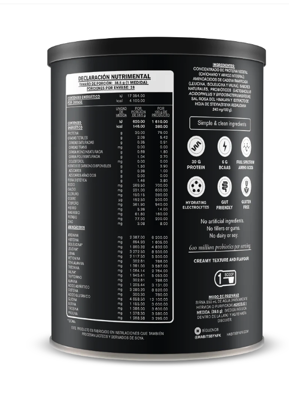 30 g de proteina vegana de alta biodisponibilidad. 6 gramos de BCAAs. Aporte de electrolitos para favorecer la hidratación. Certificacion Kosher. Perfil completo de aminoácidos. Sin rellenos ni gomas para una fácil digestión. 610 millones de probióticos por porción. Keto friendly. Sin azúcar añadida. Delicioso sabor.