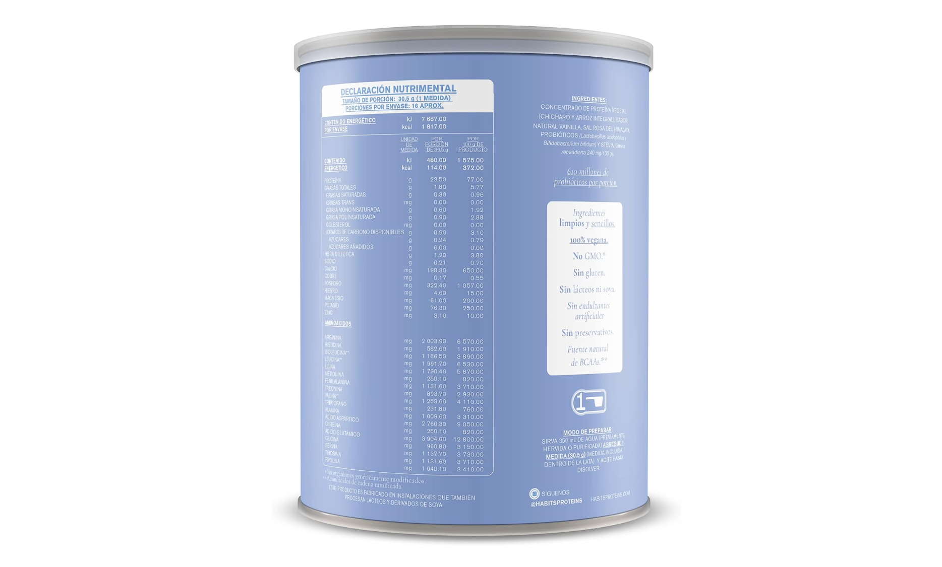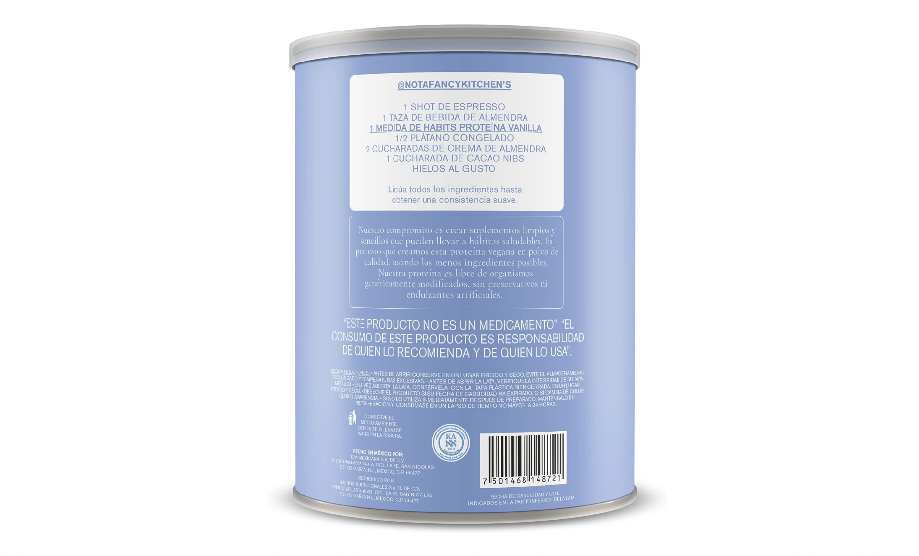 Habits Vegan Protein by Not a Fancy Kitchen, es una proteína 100% natural, de origen vegetal, libre de transgénicos, de gomas, de soya y de saborizantes artificiales, sin lácteos ni gluten. Sin azúcar. Fuente natural de Calcio y Hierro. Adicionada con probióticos.